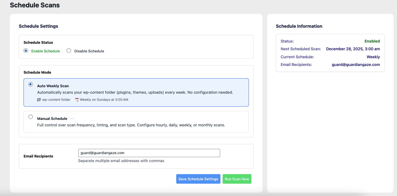 Malware patterns and detection logic are updated daily through the Guardian Gaze Security Intelligence API. Updates evolve continuously as new WordPress-specific threats, malware variants, and attack techniques emerge.