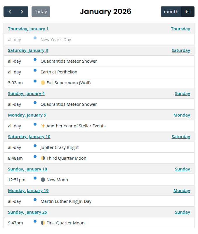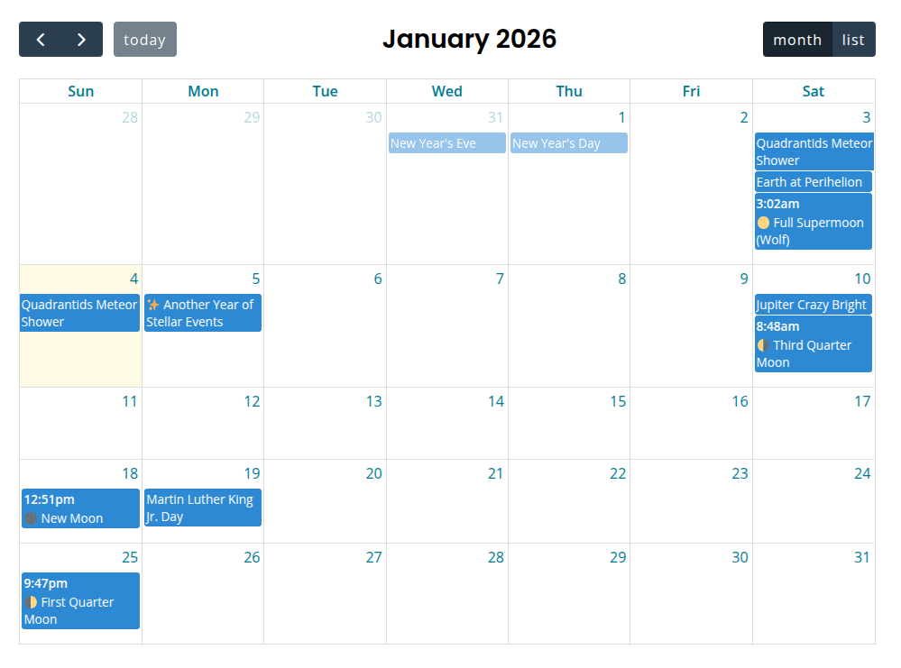Tip: listCustom allows you to set the number of days you want to display from the current date. Whereas listMonth shows all events from this month (including past events), using views="dayGridMonth, listCustom" custom_days="28" will show the next 28 days across months.