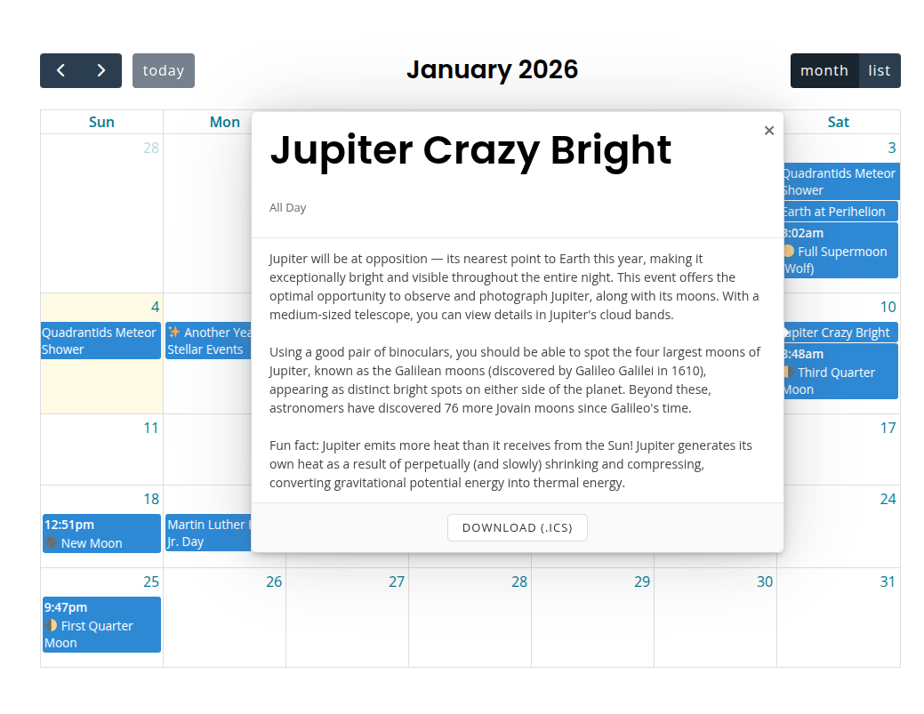 Hydrogen Calendar Embeds implements the excellent Full Calendar for you, and tosses in a little Tippy.js and Popper to make things… well… pop.