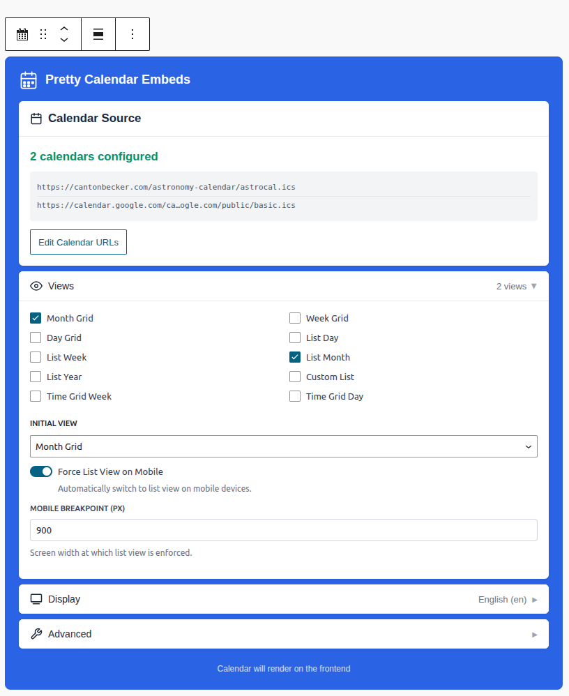 Public ICS/iCal feed URL(s). Works with any standard ICS feed: Google Calendar, iCloud, Outlook, Nextcloud, Teamup, corporate Exchange servers, and more. Multiple ICS feeds can be comma-separated. The plugin fetches the ICS data server-side to avoid CORS issues.