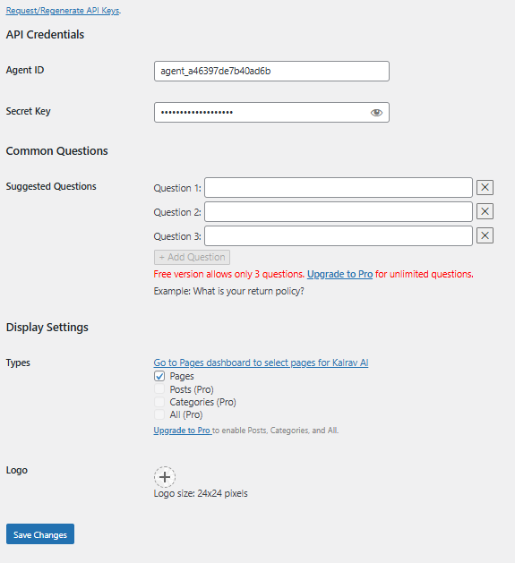 - Go to Settings Kalrav API Settings, enter your Agent ID, secret key, prompts, and logo
